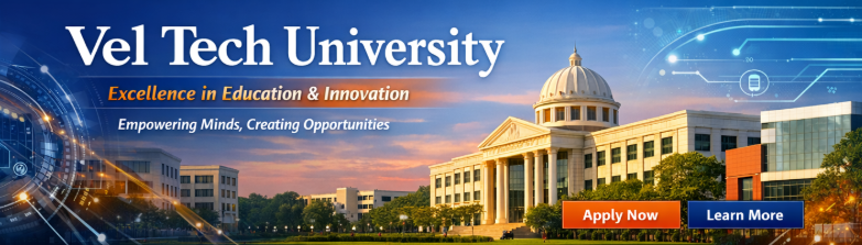 Established in 1997 by Founder President & Chancellor Col. Prof. Vel. Dr. R. Rangarajan and Foundress President Dr. Sagunthala Rangarajan, Vel Tech Rangarajan Dr. Sagunthala R&D Institute of Science and Technology is a premier Deemed to be University located in Chennai. The institution is dedicated to nurturing "model citizens" through high-quality education and a research-driven environment. Recognized as a Category-1 Deemed to be University by the UGC, Vel Tech has earned the prestigious NAAC 'A++' Grade with a CGPA of 3.53. With a sprawling campus and state-of-the-art infrastructure, it serves over 14,000 students and is consistently ranked among the top 100 engineering institutions in India by NIRF.